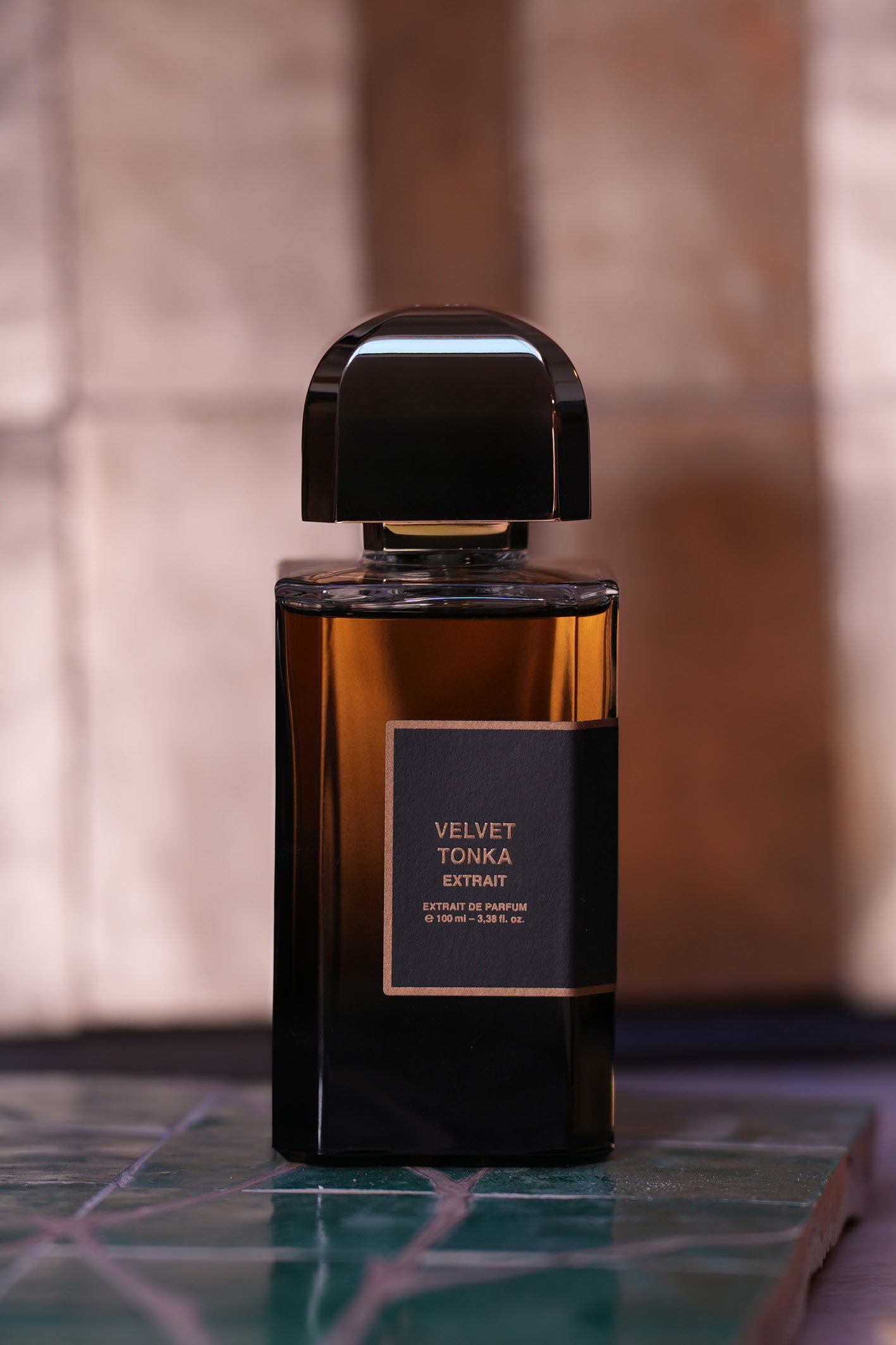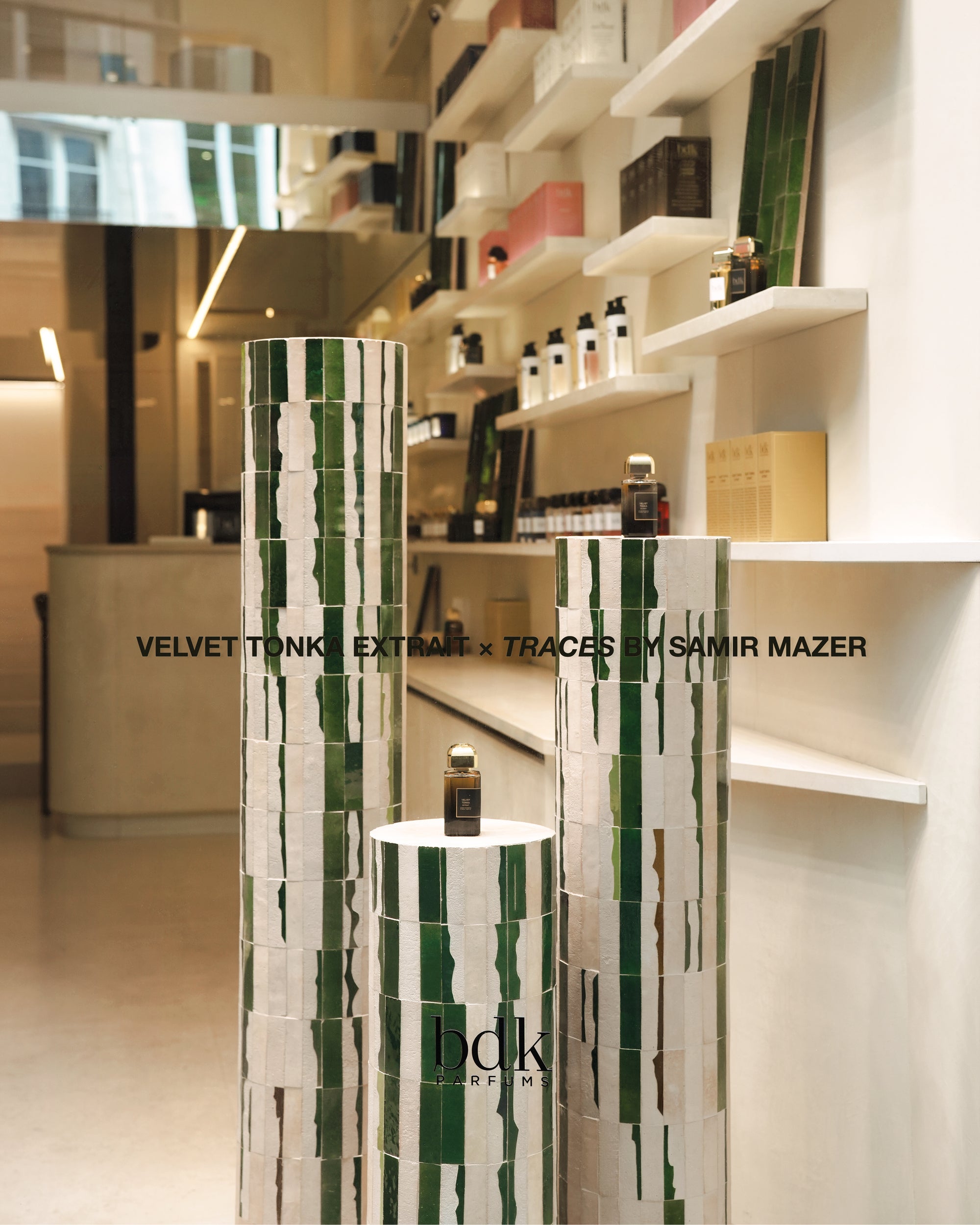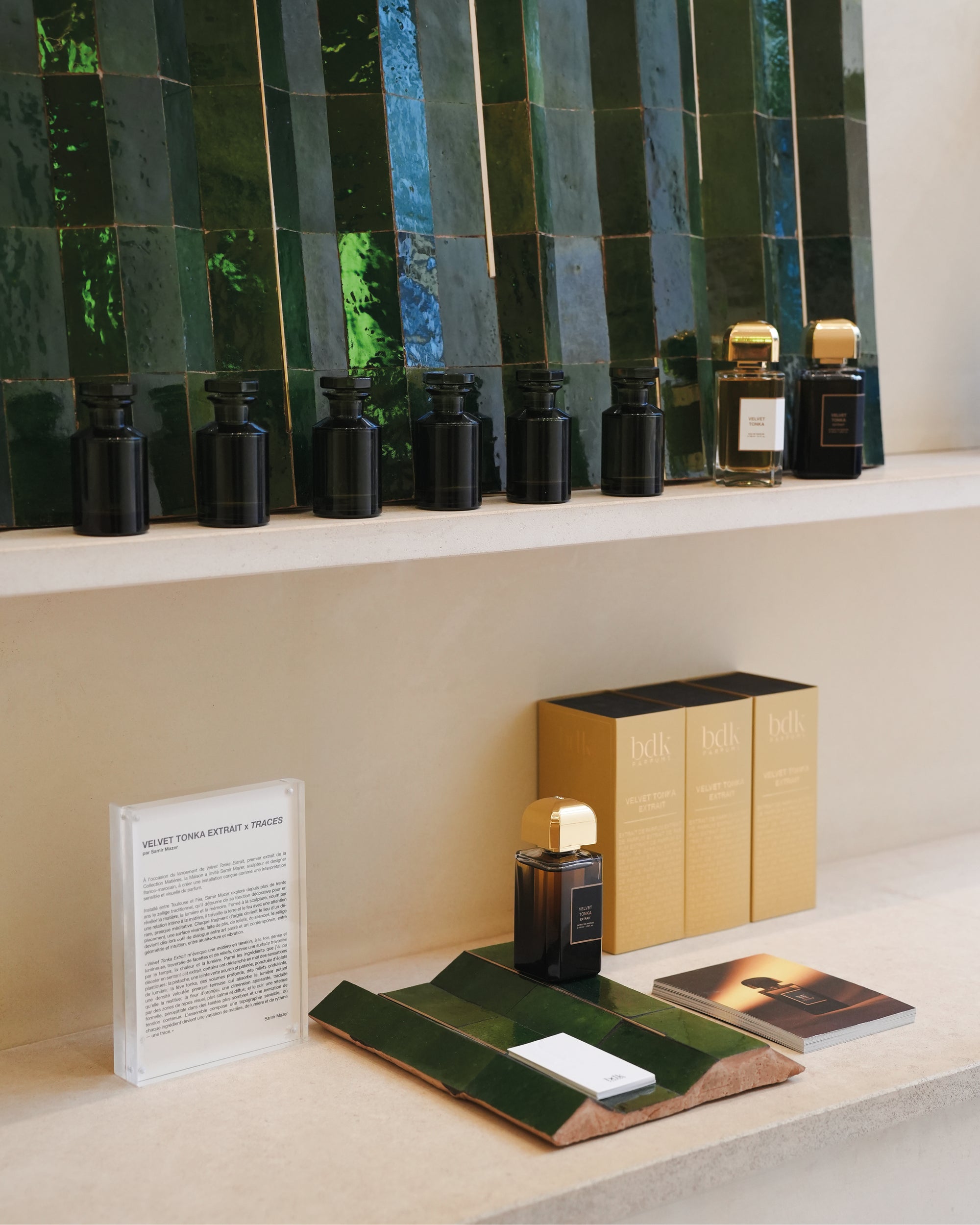 Dans le cadre de cette collaboration, le dialogue avec les matériaux de la boutique BDK Parfums s’est imposé naturellement. La pierre de Bourgogne et le zellige partagent une qualité essentielle : une mémoire géologique, une densité silencieuse, et une beauté qui se révèle dans la nuance, la patine et l’imperfection. Leur dialogue repose sur la complémentarité. La pierre absorbe la lumière, la retient et l’ancre dans l’espace ; le zellige, au contraire, la capte et la renvoie. J’ai également souhaité introduire des inserts de laiton, comme des points de lumière surgissant de la matière. Ce choix fait écho au flaconnage de BDK Parfums, au bouchon doré de la Collection Matières, ainsi qu’à la teinte subtilement mordorée du nouvel extrait. Ces éclats métalliques prolongent visuellement l’univers de Velvet Tonka Extrait.