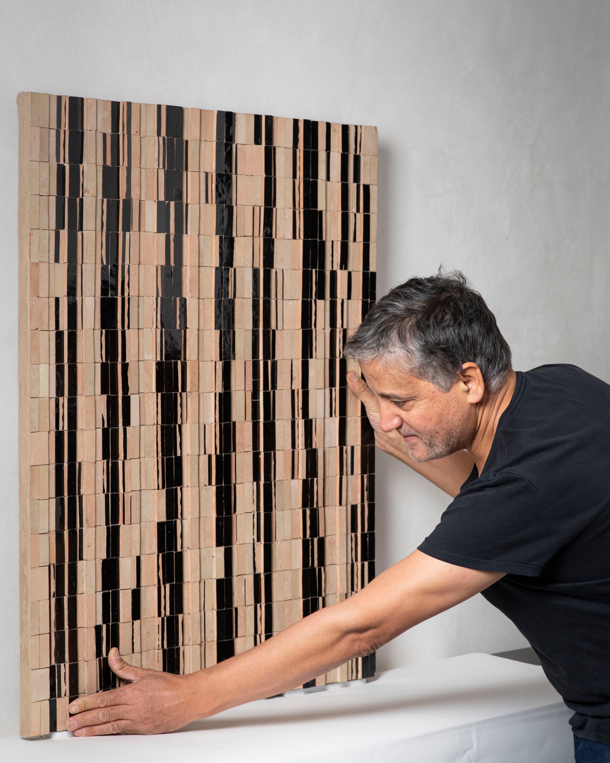 Dans une volonté de prolonger l’histoire de cet art millénaire, il le requestionne à différentes échelles, de la fresque murale aux pièces sculpturales, en y insufflant une sensorialité inédite. Chaque fragment d’argile devient alors un lieu de déplacement, une surface vivante faite de plis, de reliefs et de silences. Libéré de sa seule fonctionnalité, le zellige s’émancipe et se métamorphose dans le regard de l’artiste. Il devient un outil de dialogue entre art sacré et art contemporain, entre géométrie et intuition, entre architecture et vibration.